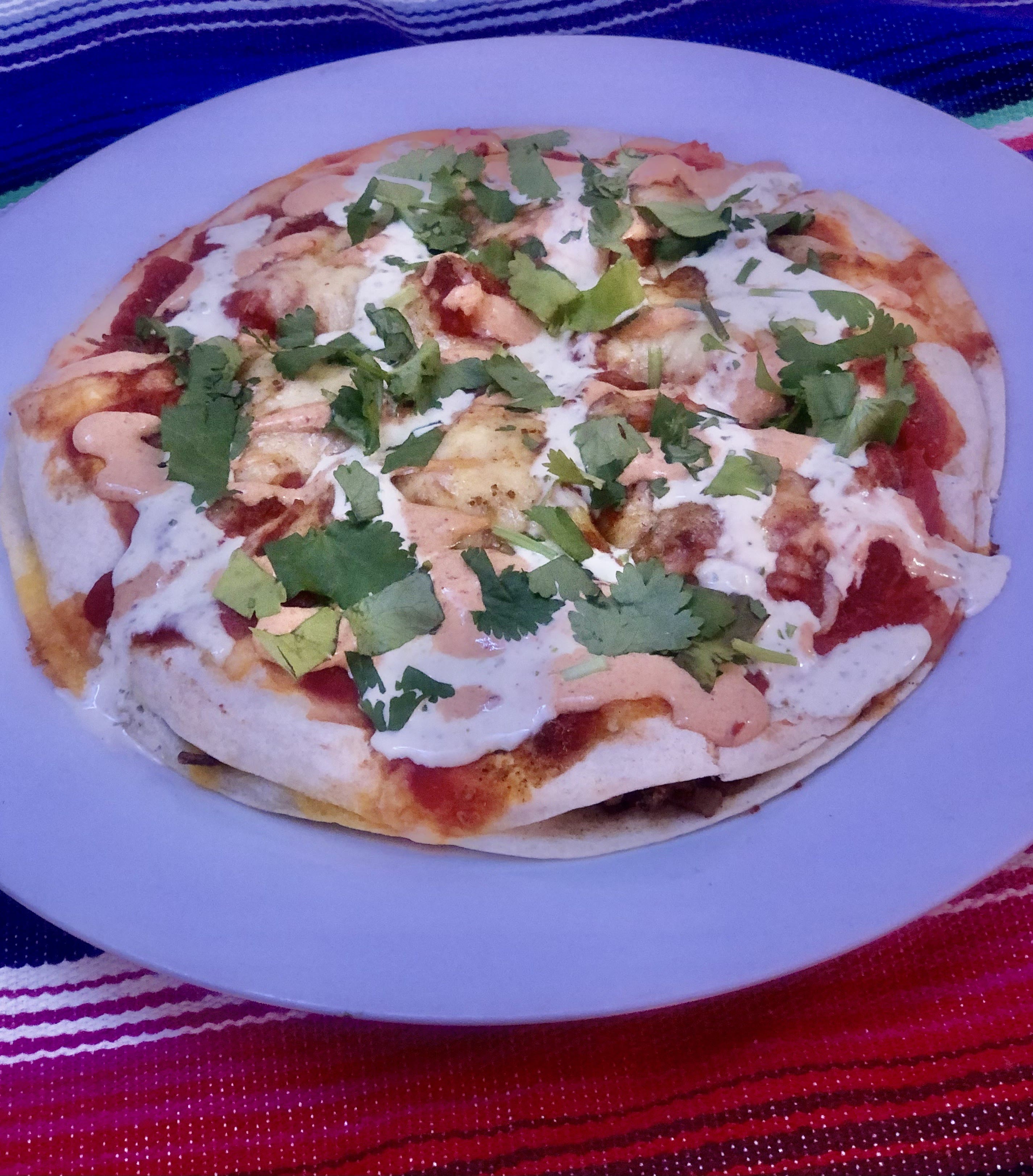 An old-school fan-favorite in the U.S.► it's a hybrid between a quesadilla and an Italian 'pizza' - made with two crisped flour tortillas layered with refried beans, our delicious Beef Barbacoa or Spiced Tofu and two types of cheeses - plus tomato sauce, Mexican seasonings, fresh cilantro and our two flavorful sauces (Cilantro-Lime Ranch and Chipotle Mayo). Approximately 25cm round with 6 slices – enough for two appetites or one very hungry one :)